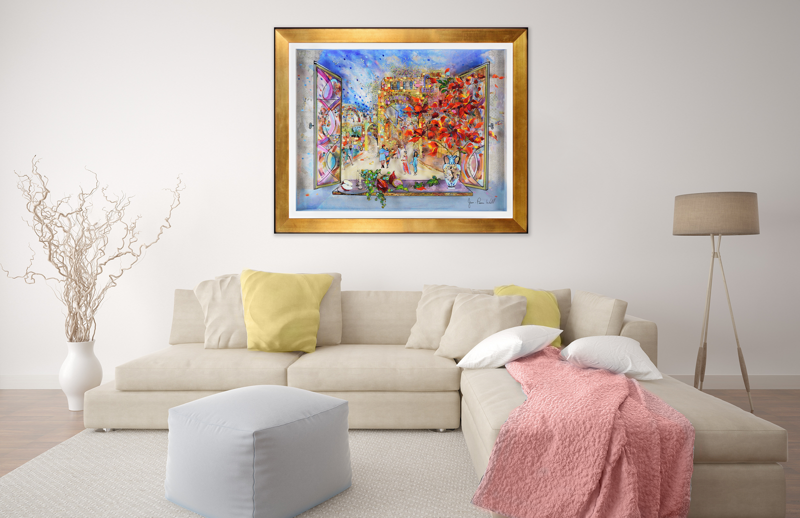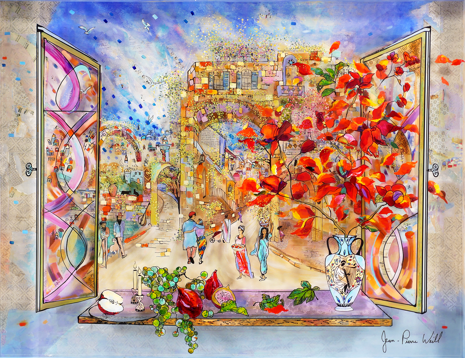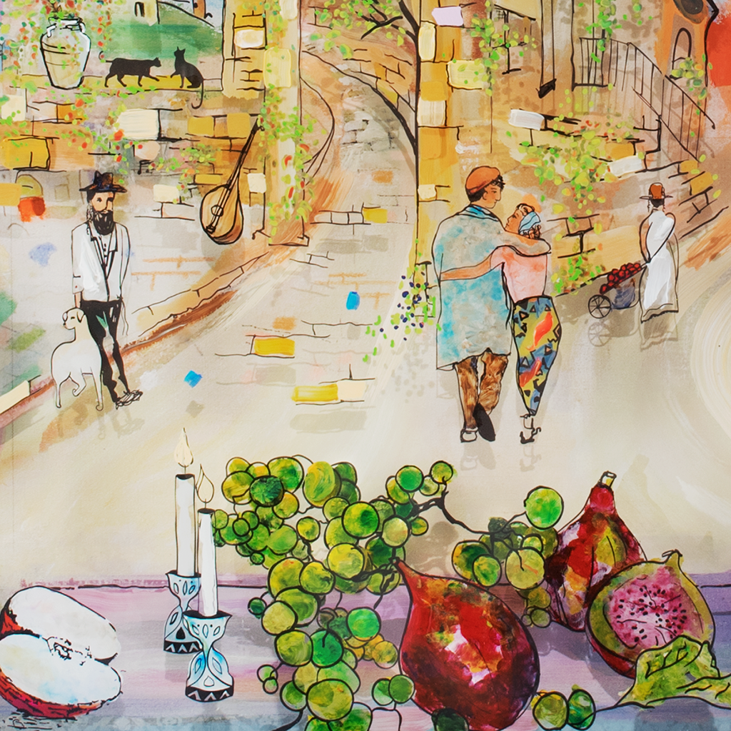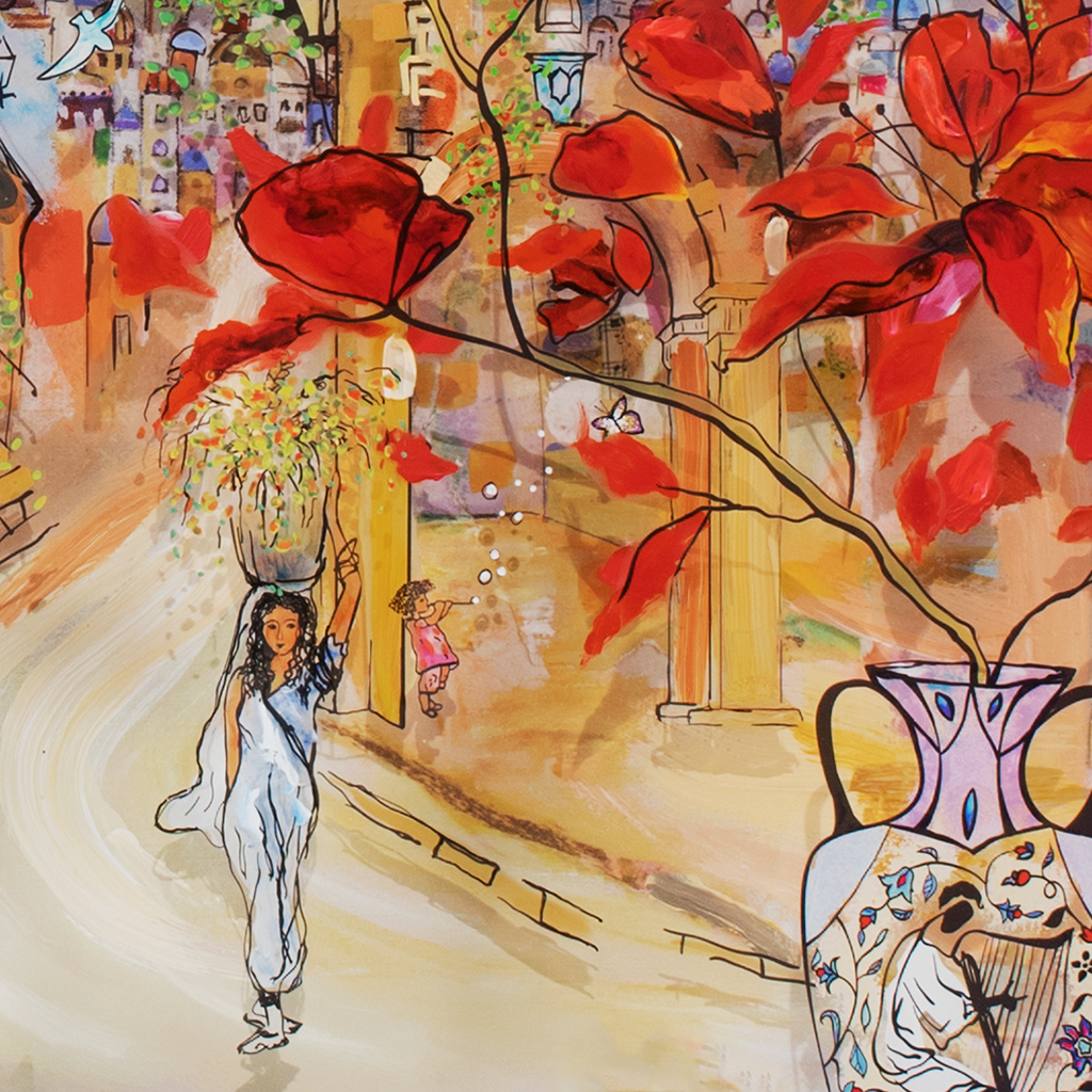 In Milk and Honey, the promise of what Jerusalem - Ir Shalem - City of Peace - is in her heart, comes alive. Look carefully, and you will find hints of the seven species of the Holy Land interspersed throughout the painting, representing the rich bounty that the Land of Israel holds in her potential and in her reality.
