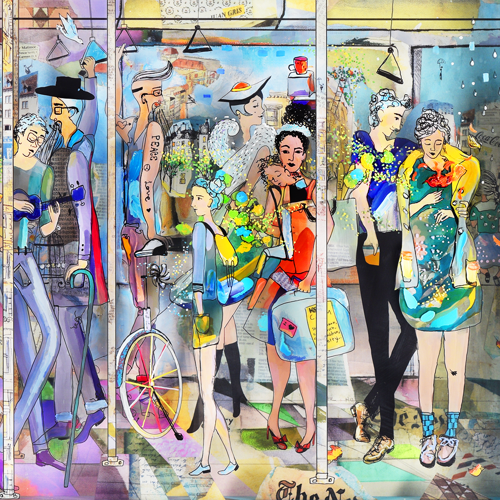 In Soul Train, each individual comes from a different world, yet threads of their stories, as depicted through paint and fantasy, are entwined - the history of a loving elderly couple is mirrored by the dancing young man and woman in front of them, a woman wears furs identical to that of a polar bear. Is the bear real or a child’s drawing? A wealth of details brings each character to life and the use of bright colors, dynamic interactions, and humor make this painting an eye-catching centerpiece.