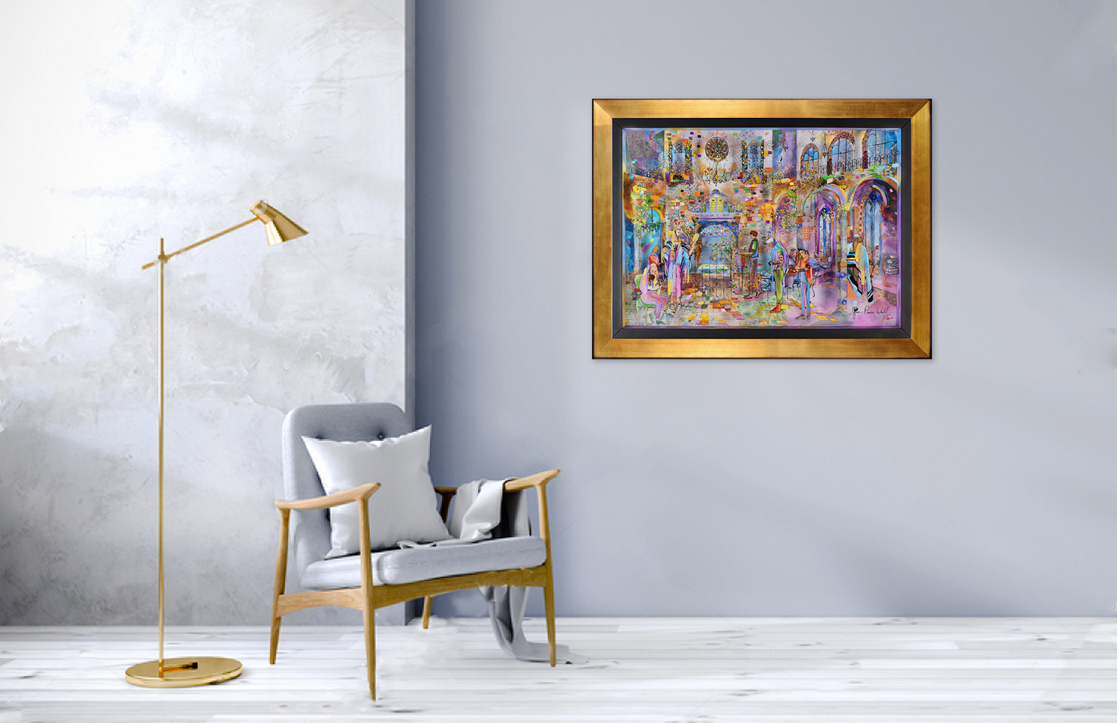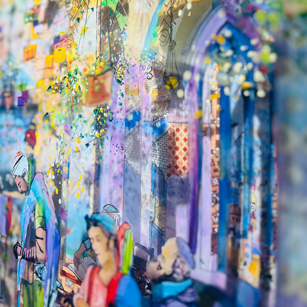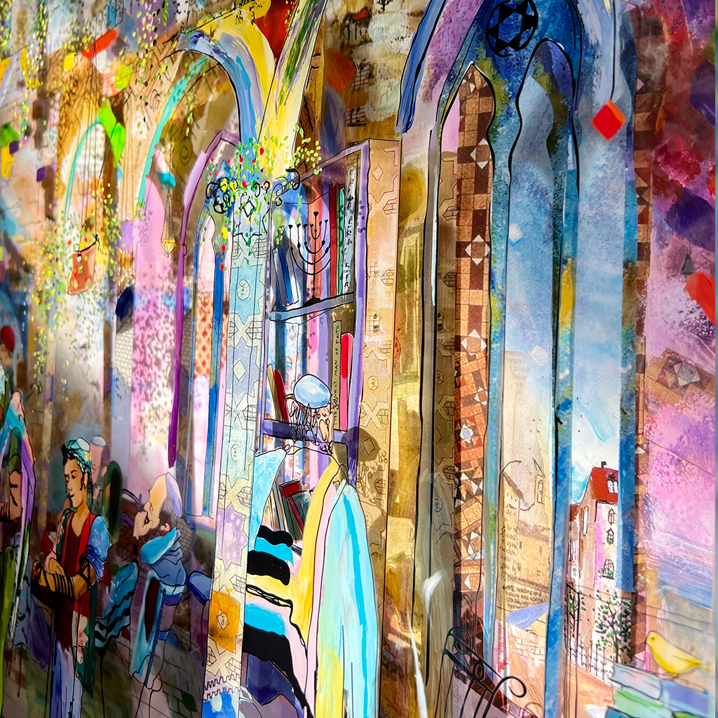 Nine men have gathered to form a minyan, and they wait for a tenth to complete the quorum. A special power is attributed to the community of ten which creates a Place where God’s Presence (Shechina) can rest. The simple choice to show up brings a Presence that does not exist in the world of individual prayer. In a unique addition touch and through an artful appreciation for the reflective quality of glass, when you look at this painting, you step inside, the synagogue comes to life, and you are the one who completes the quorum.